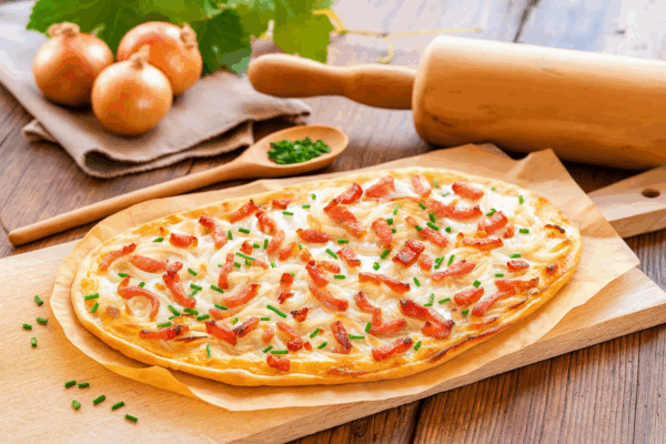 8.50 €Knuspriger Boden mit hausgemachter Sauce, Speckwürfeln, roten Zwiebeln und zarten Lauchstreifen.